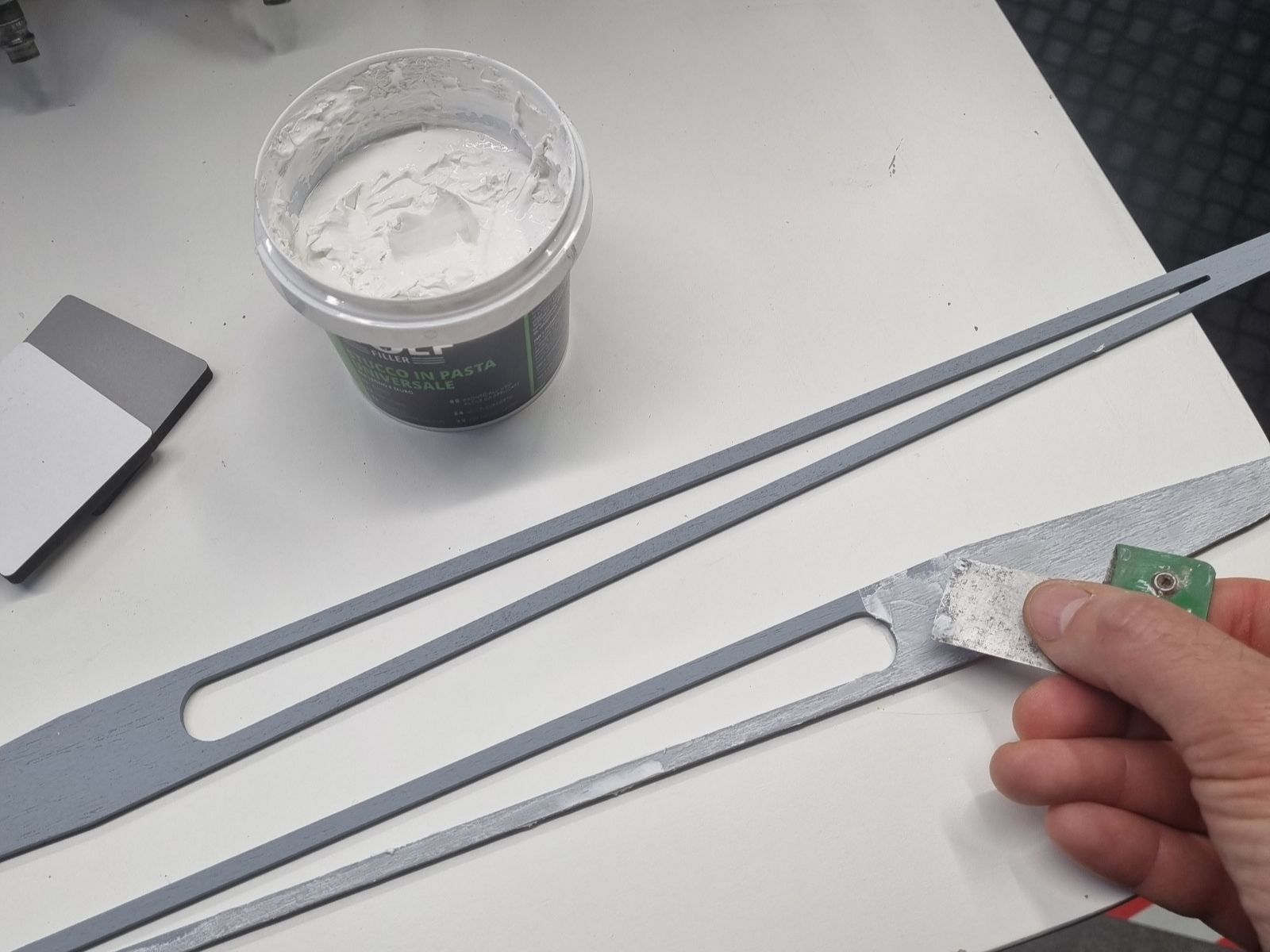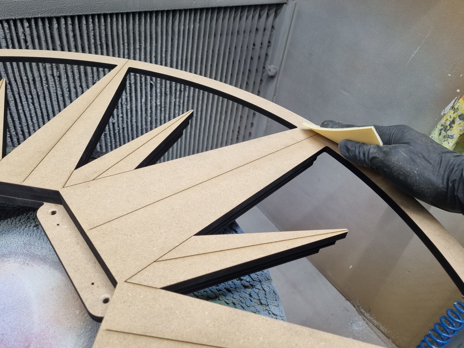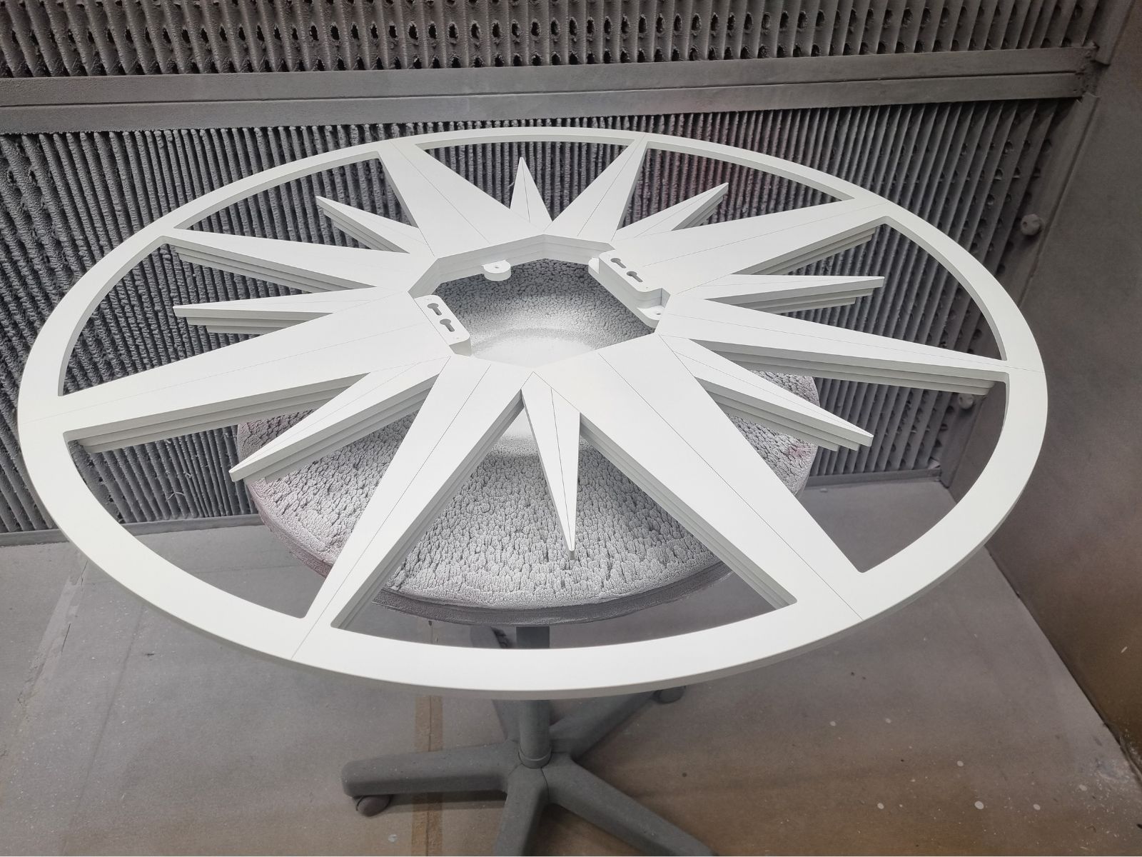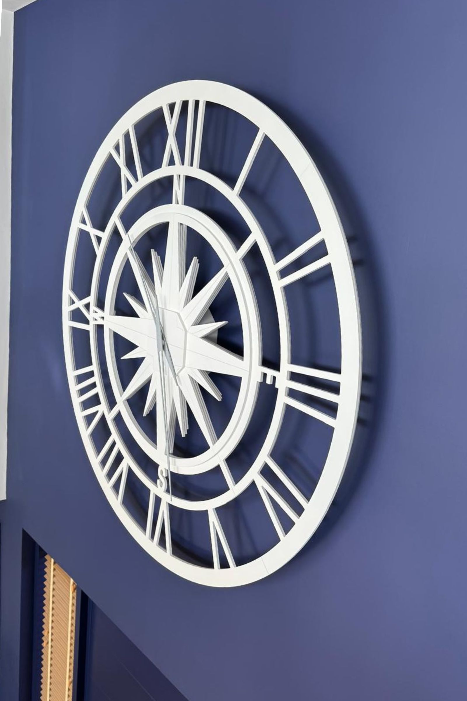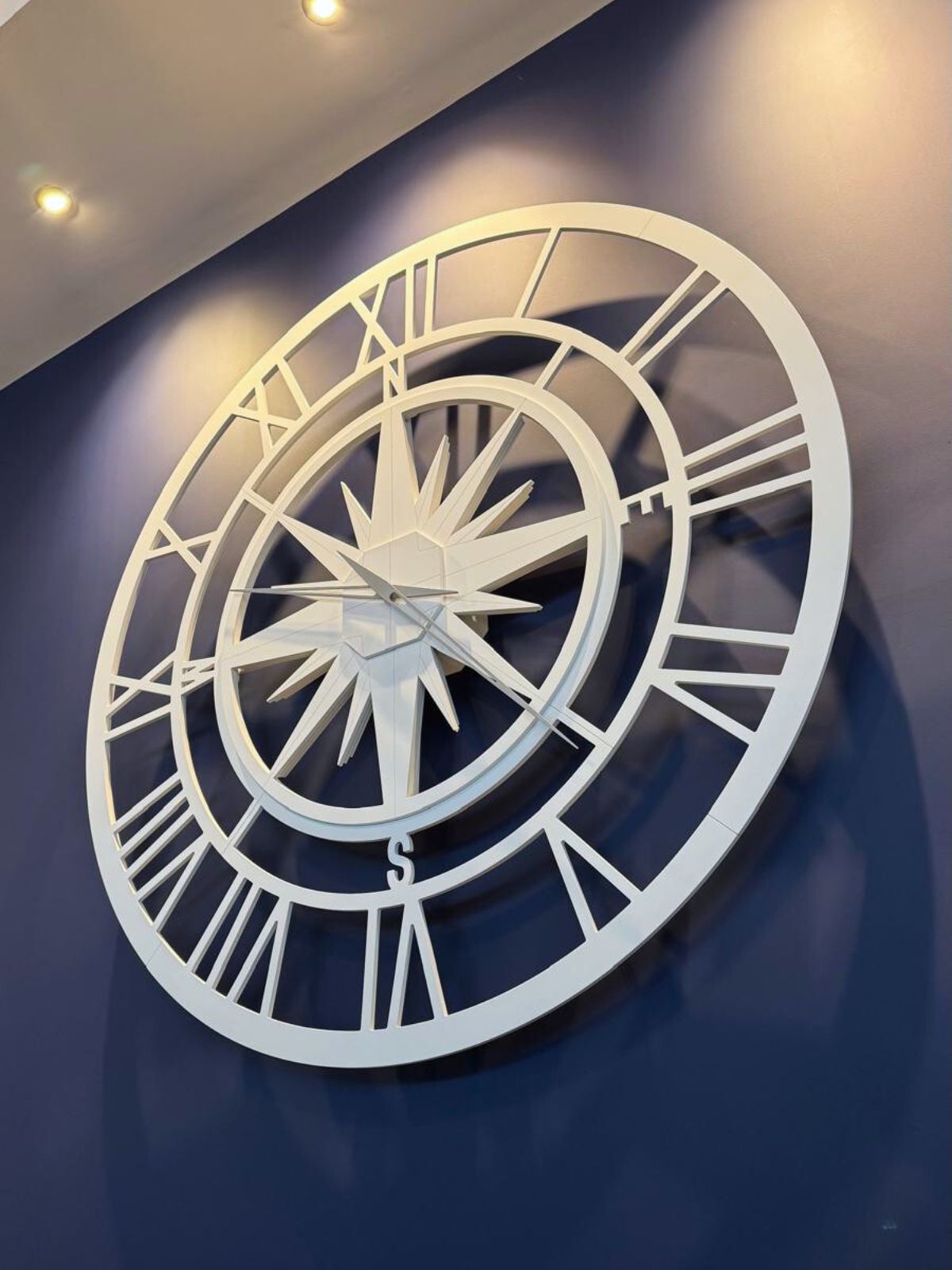 Dopo le prime conversazioni, ci siamo messi all’opera nel nostro laboratorio di Trieste. Abbiamo ascoltato, immaginato, disegnato. La richiesta di un’estetica nautica ci ha guidati verso un simbolo iconico: una rosa dei venti, delicatamente intagliata, leggera come una brezza. Il tutto declinato in bianco monocromatico, per danzare in contrasto perfetto con il blu profondo della parete.