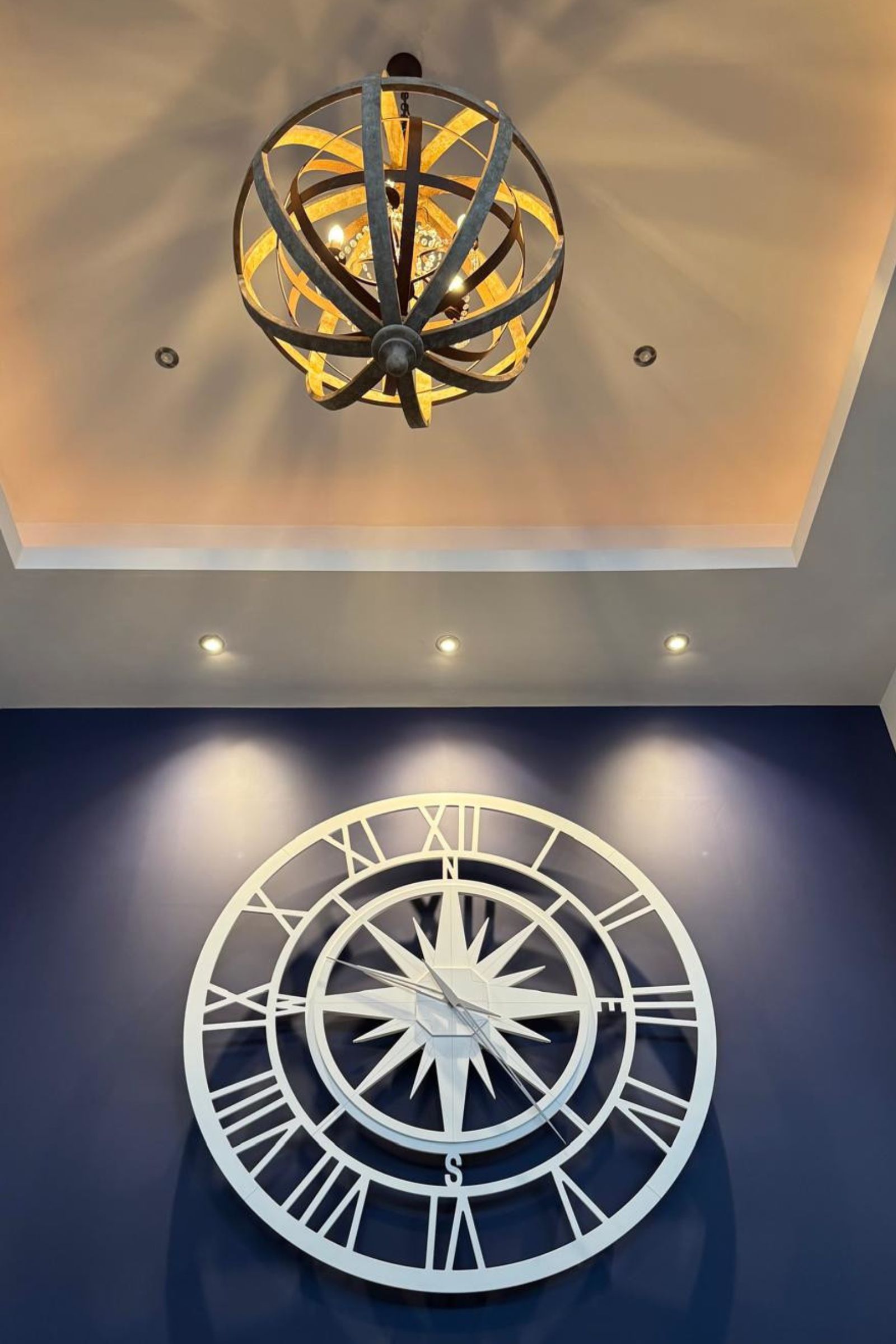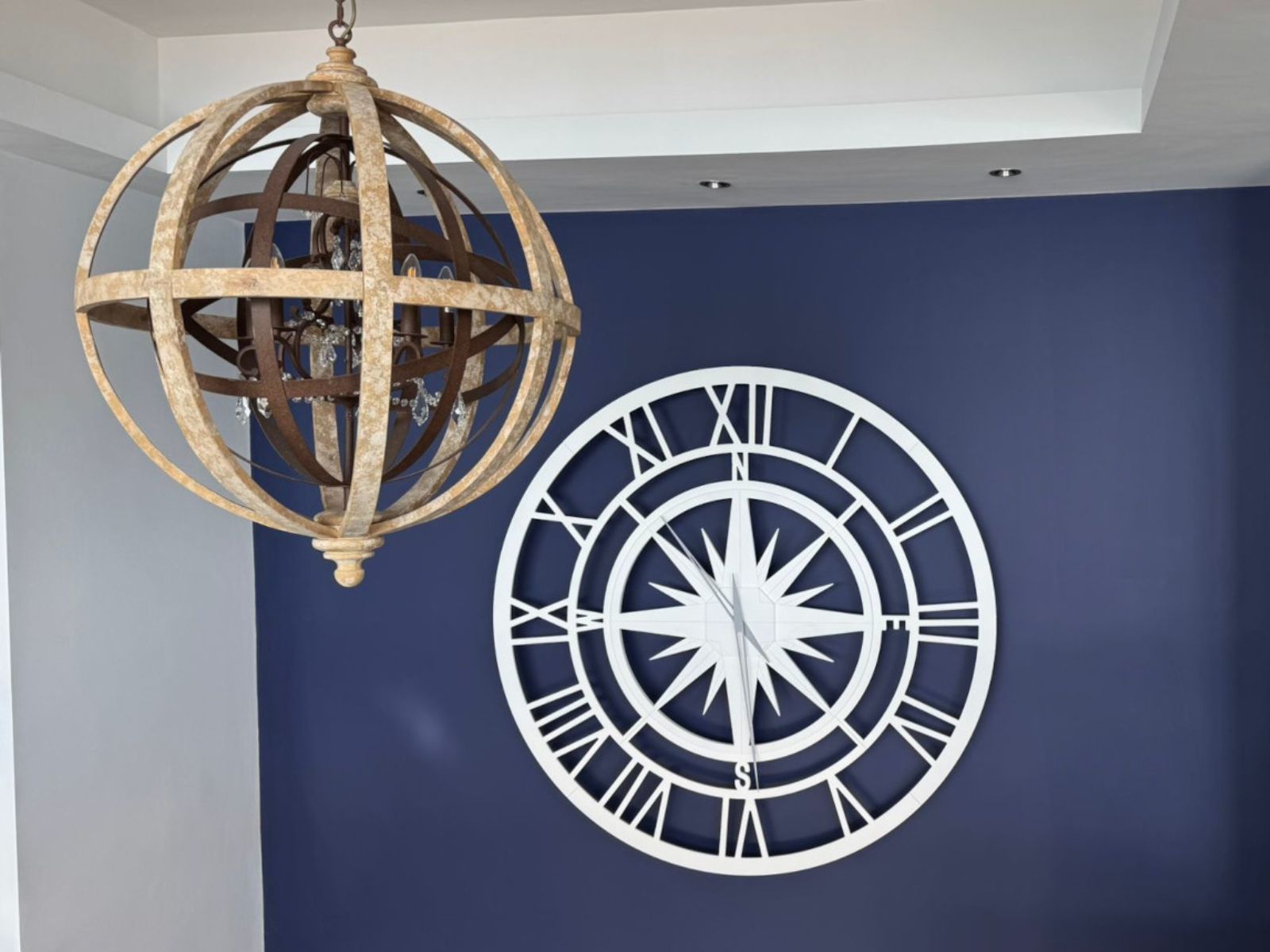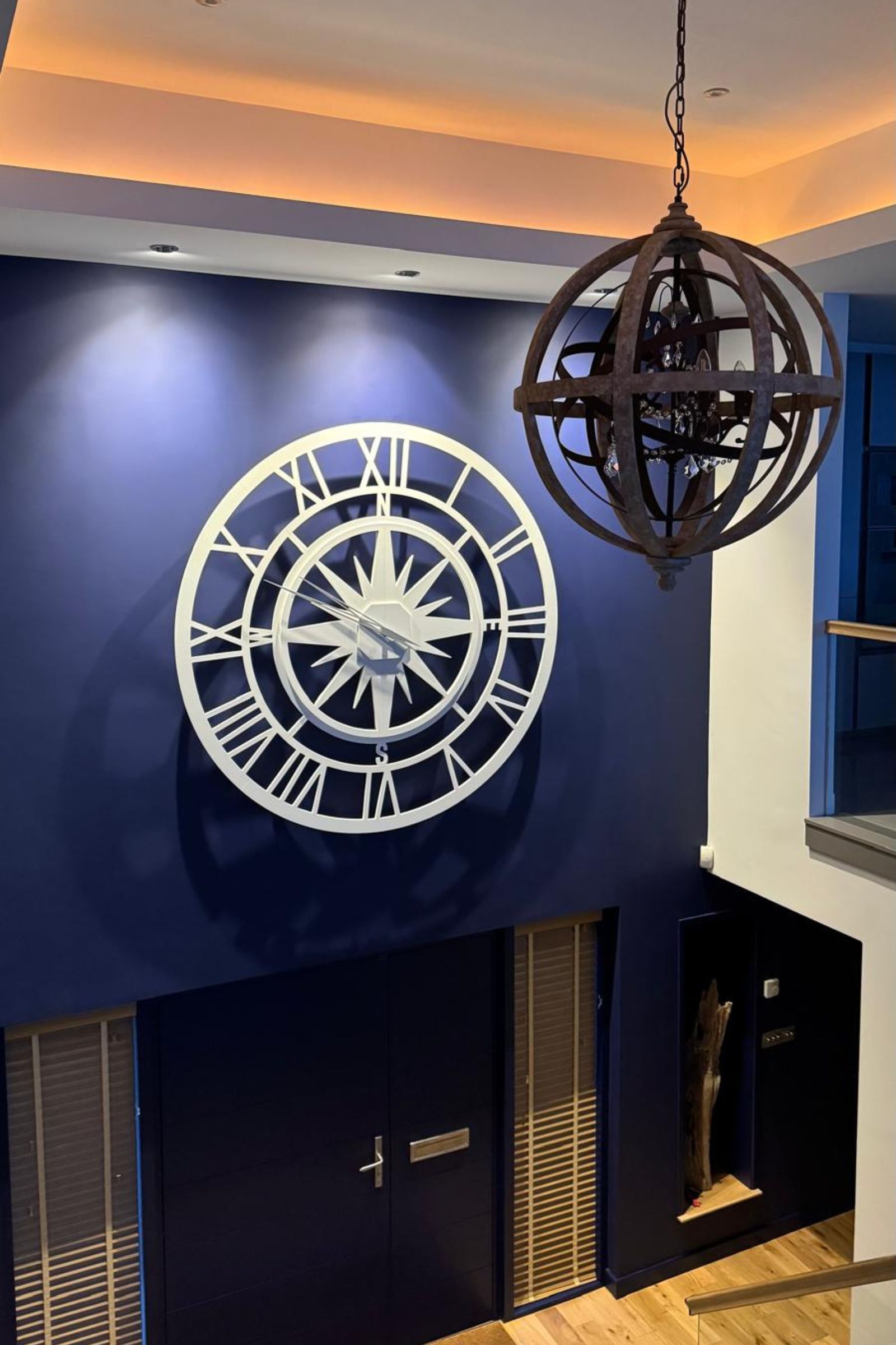 La hall era ampia, con soffitti alti e una parete blu navy che sembrava aspettare proprio quell’elemento giusto per completarla. Non serviva un semplice orologio: serviva un oggetto scenografico, unico, capace di catturare lo sguardo senza essere invadente. Qualcosa che avesse un’anima, una presenza elegante e leggera.